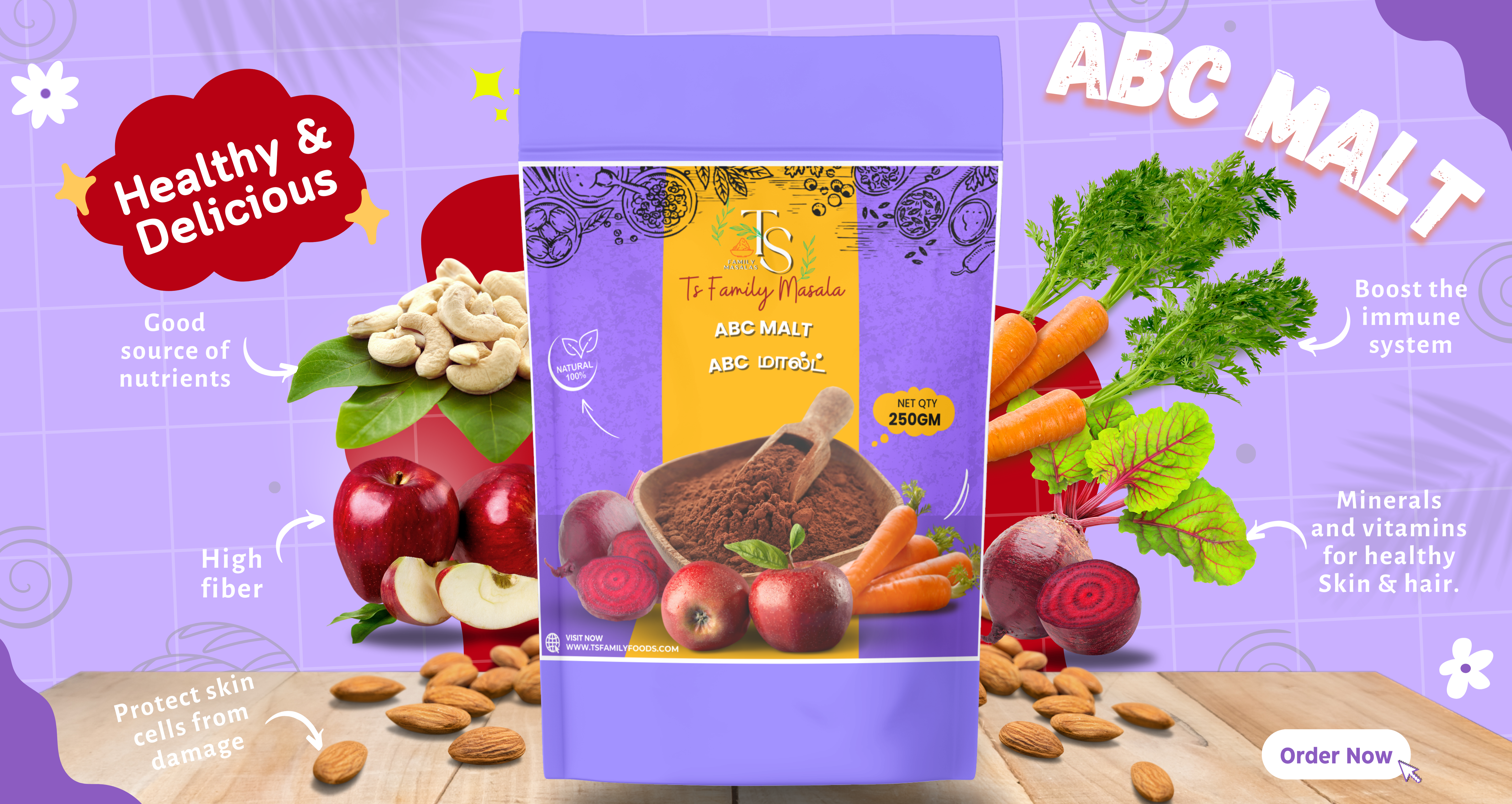 Nourish and Energize with TS Family Masala’s ABC Malt Experience the wholesome goodness of TS Family Masala’s ABC Malt, a nutritious blend of Apple, Beetroot, Carrot, Almonds, Cashews, Cardamom, Country sugar. This malted drink mix...