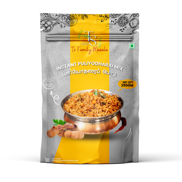 Delight in the bold flavors of Instant Puliyodharai Mix with TS Family Masala’s Instant Puliyodharai Mix, a spicy blend of roasted Chilly, Coriander, Turmeric, Dhall,Bengal Gram Dhall, Citric Crystals,Mustard, Tamarind Powder, Compounded Asafoetida (Wheat Flour, Edible Gum,Asafoetida) & Salt Handcrafted with care, this homemade powder adds a fiery kick and depth of flavor to your dal preparations, enhancing them with the authentic taste. TS Family Masala ensures each batch is free from preservatives, artificial substances, and food coloring, preserving the natural essence of ingredients.