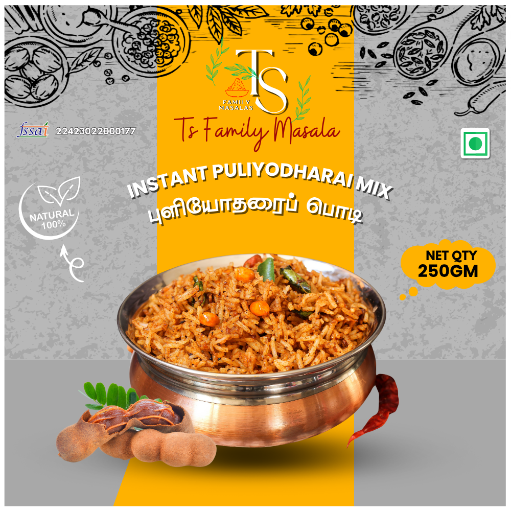 Delight in the bold flavors of Instant Puliyodharai Mix with TS Family Masala’s Instant Puliyodharai Mix, a spicy blend of roasted Chilly, Coriander, Turmeric, Dhall,Bengal Gram Dhall, Citric Crystals,Mustard, Tamarind Powder, Compounded Asafoetida (Wheat Flour, Edible Gum,Asafoetida) & Salt Handcrafted with care, this homemade powder adds a fiery kick and depth of flavor to your dal preparations, enhancing them with the authentic taste. TS Family Masala ensures each batch is free from preservatives, artificial substances, and food coloring, preserving the natural essence of ingredients.