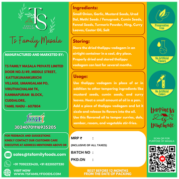 Savor the traditional flavors of South India with TS Family Masala’s Small Onion Thalippu Vadagam, a crunchy and aromatic seasoning made from small onions and a blend of spices. Handcrafted with care, this homemade vadagam adds a unique depth of flavor to your dishes, enhancing their taste with every sprinkle. TS Family Masala ensures each batch is free from preservatives, artificial substances, and food coloring, preserving the natural essence of small onions and spices.
